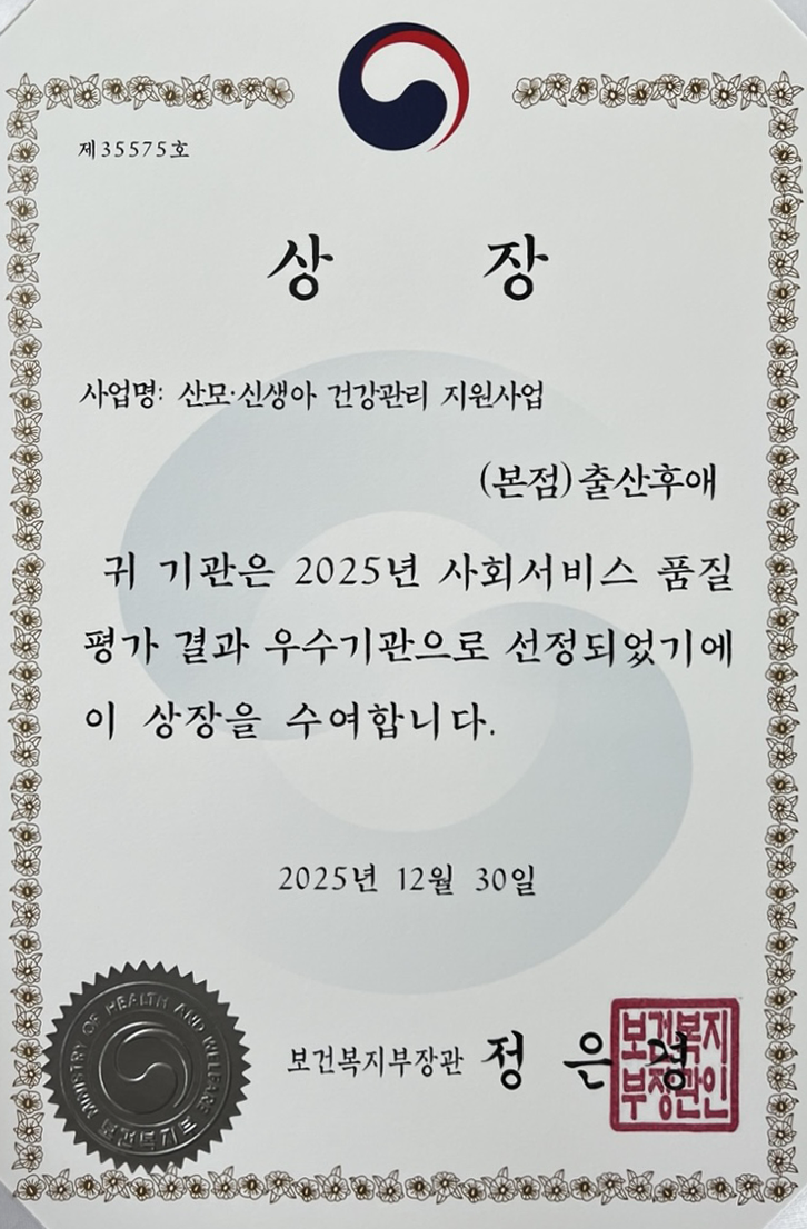 이번 수상은 산모·신생아 건강관리 지원사업을 수행하는 기관으로서 서비스의 품질과 전문성, 안정성, 그리고 운영 전반에 걸쳐 정부로부터 공식적인 신뢰와 평가를 받았다는 점에서 더욱 의미 있는 결과입니다.
